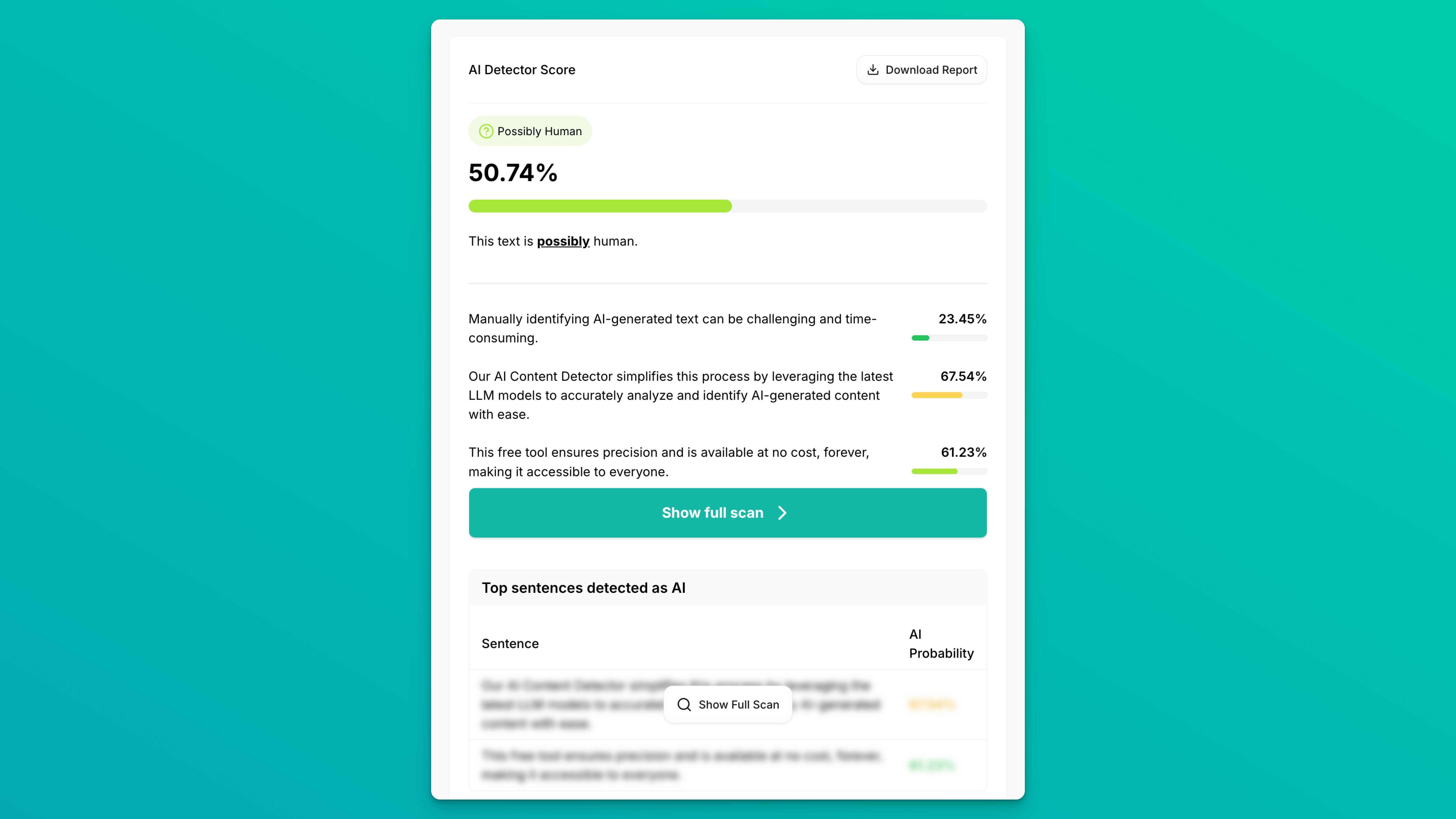 Manually identifying AI-generated text can be challenging and time-consuming. Our AI Content Detector simplifies this process by leveraging the latest LLM models to accurately analyze and identify AI-generated content with ease. This free tool ensures precision and is available at no cost, forever, making it accessible to everyone.